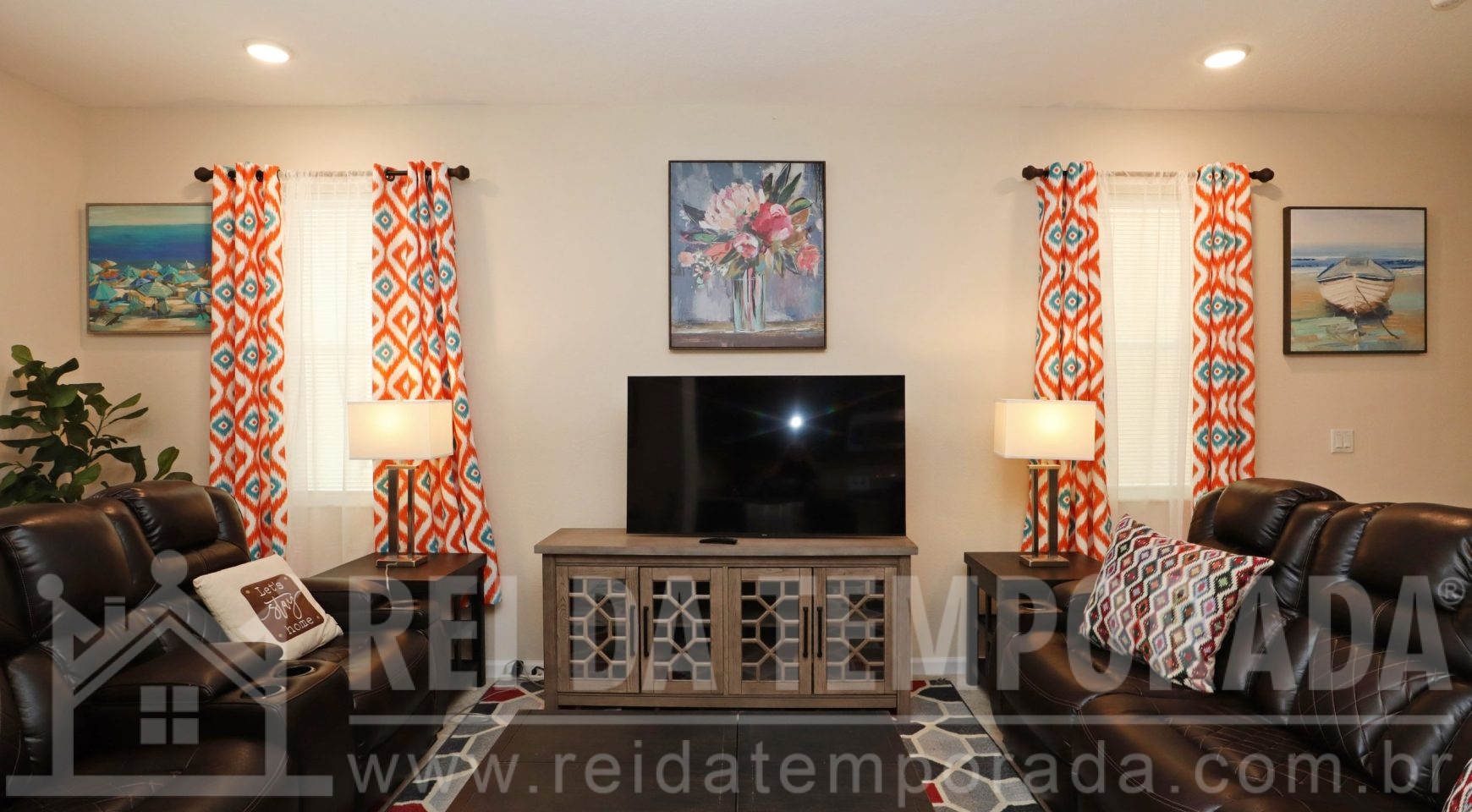SALA DE ESTAR: Este quarto de estilo contemporâneo tem sofás de couro para relaxar, enquanto desfruta da Smart TV de tela grande.
